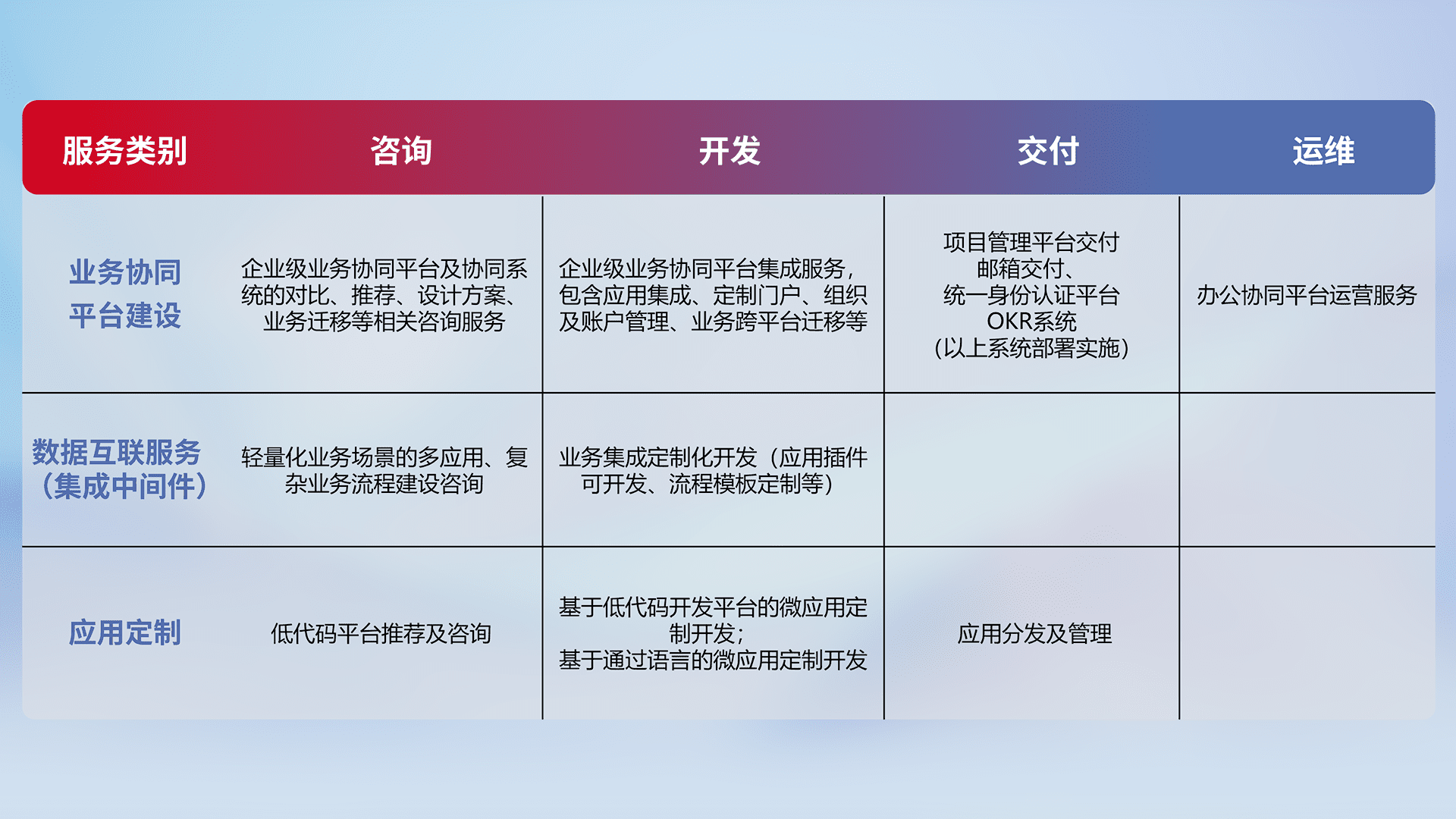 针对钉钉、、、企微、、、IDaas等平台级产品提供产品的规划、、、、方案、、、、交付、、定制化开发等服务,,,,实现如统一协同办公、、智能客户服务、、混合会议管理、、、、智能数据查询、、等业务场景,,,实现数字化转型。。。。